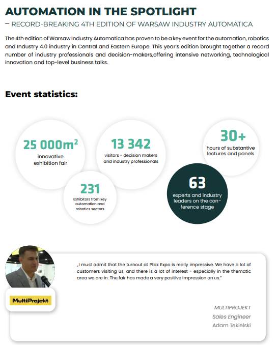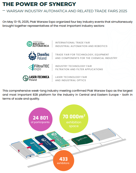 华沙工业自动化展是由国际工业博览会——华沙工业周衍生而来的一项活动,该活动在PTAK Warsaw EXPO举办,过往几届均取得了巨大成功。最初,它是工业博览会的一个展区,但看到它的动态发展,以及听取行业的声音和参展商的建议,PTAK Warsaw EXPO决定组织一个单独的活动,专门为自动化和机器人行业。这是波兰最大、最现代化的综合贸易博览会,致力于商业、商业和娱乐活动。其创建的想法是根据一个创新的展览系统组织交易会、大会、培训课程、群众活动和其他活动。普塔克华沙博览会的优越位置,位于设施10分钟从该国最大的肖邦机场,15分钟从华沙的中心,使PWE赢得了它的名字作为欧洲商业之都。