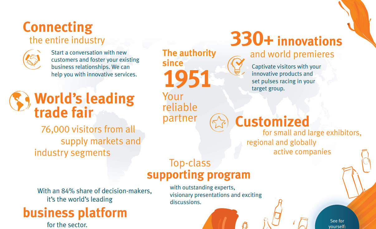 该特别展会受益于世界领先的贸易展 Drinktec 提供的全面的灌装和包装技术。该系列包括用于植物和动物油脂生产和深加工的机器、组件和辅助设备。oils+fats被指定为C3馆的一个特殊区域。上届展会,来自 16 个国家的约 50 家参展商展示了他们针对油脂行业的最新机械、设备、部件、工艺和解决方案。这使其成为植物和动物油脂生产商、精炼商和贸易商最重要的行业聚会场所。